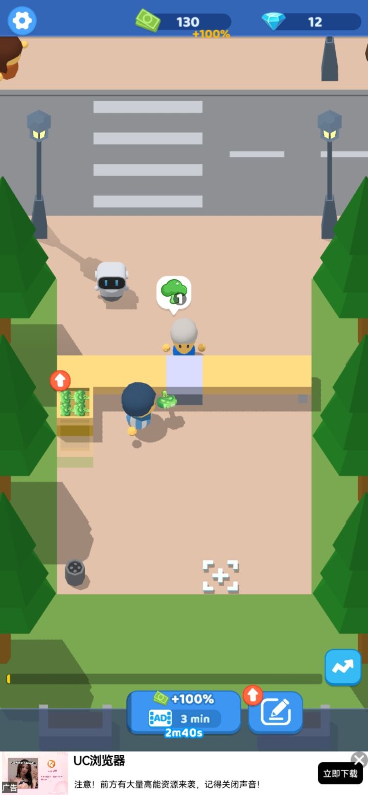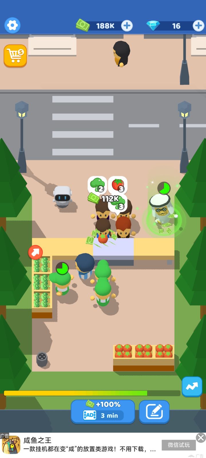 以前总想着没钱了就去摆摊,这不想着想着就来到游戏摆摊卖菜了~西兰花,西兰花,绿色营养,老奶奶来一颗吗?那给我来一颗吧~和其他游戏不同,这游戏不用经常点击,直接放在那里就行,顾客知道自己买菜和给钱,解放双手有木有,哈哈哈~有钱和钻石了可以升级一下卖菜效率和摆摊规模~