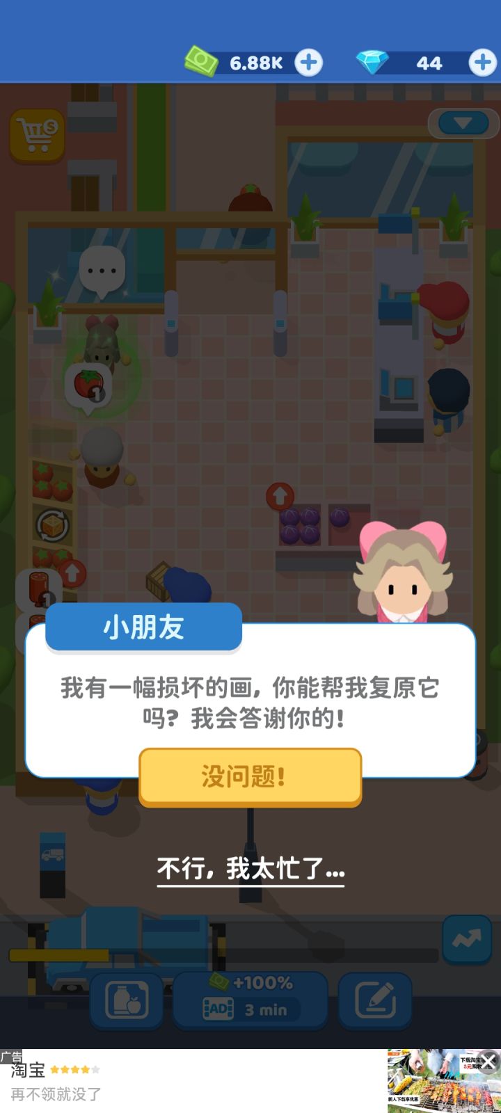 感觉画风还可以,普通的挂机类游戏,点点点挣钱,然后升级,然后赚更多的钱,升级有很多渠道有升级货架的,升级收银速度的,升级取货速度的有很多,作为挂机游戏,并不特别枯燥,感觉还可以,但不是特别的耐玩