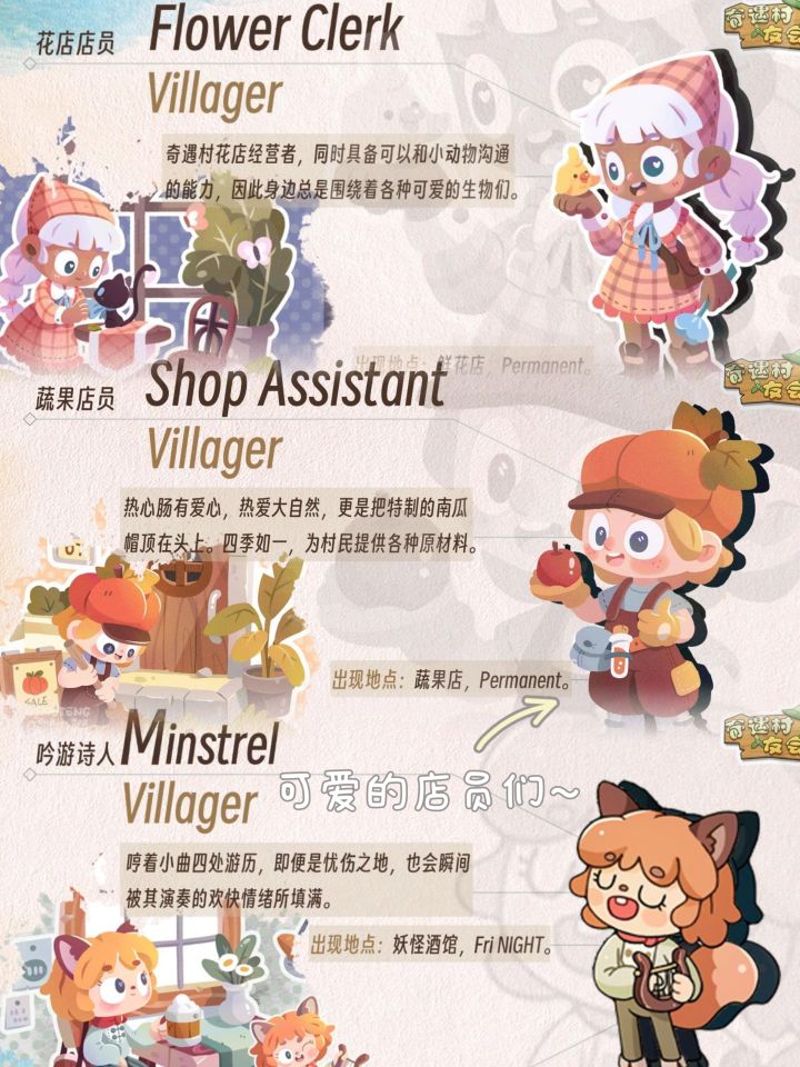 【NPC背景】奇遇村最受欢迎的花店专营店员,但她被村民们所熟知是因为她可以听懂小动物们的语言,并且能顺畅的和它们进行交流。因此每天早上还没有开门的时候,花店前就聚集了各种可爱的小生物们,有很多小动物也是闻讯而来,因为它们都知道,花店店员每天开业时都会给等待在门前的小动物们赠送一份礼物。【活动说明】《奇遇村友会》NPC征名活动开启啦~我们不仅想要做一款可爱有趣的家装类游戏,还想努力营造“奇遇村