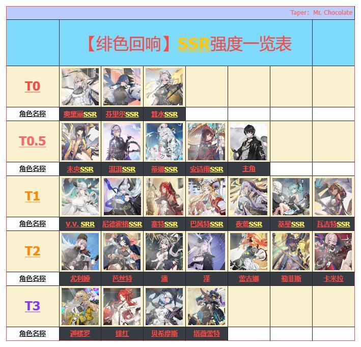 T0 SSR 奥黛丽(版本神明之子 抽到所有资源砸她即可 碾压一切卡,后排全体回能回血增伤) T0 SSR 利维坦(版本万金油回点辅助 aoe输出爆炸 各阵容都可上) T0 SSR 莫莉(版本最强刺客,后排c位的噩梦 对单输出恐怖爆炸pvp必练) T0 SSR 淇水(灼烧队核心,开局直接挂buff 技能群攻) T0 SSR 芬里尔(开局自带增伤双抗 还是抽到无脑练即可) T0.5 SSR 巴风特(
