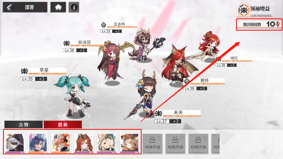 部署援助角色的方法 在角色部署界面点击“援助”按钮 点击角色布局界面左下角的“援助”按钮,界面会替换掉“古物”,切换到援助角色布局界面。虽然援助角色不能参与战斗,但可以成为队伍角色链接技能的触发对象。 将能触发链接技能的角色部署到援助位置 即使将无法触发链接技能的角色设置为援助,也不会增加战力或属性。在援助位中,应配置能与已编队角色触发链接技能的角色。另外,部署在援助位的角色等级不会影响战力,所以