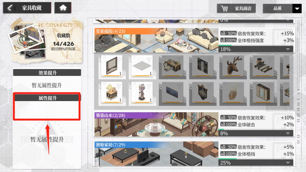 家具收集的效果 可以提升属性 如果收集齐同一系列的所有家具,就可以提升队伍中角色的属性。提升的属性都是与防御有关的。效果可以叠加,所以收集的系列越多,属性就会提升得越高。 宿舍的恢复效果提升 每当收集到一系列的50%时,宿舍的疲劳恢复效果就会提升,可以更快地恢复在生活平台工作的角色的集中力。 各系列效果一览 家具收藏效果的确认方法 ①从主屏幕点击“生活区域” ②点击"陈列室" ③点击“家具收藏” ④