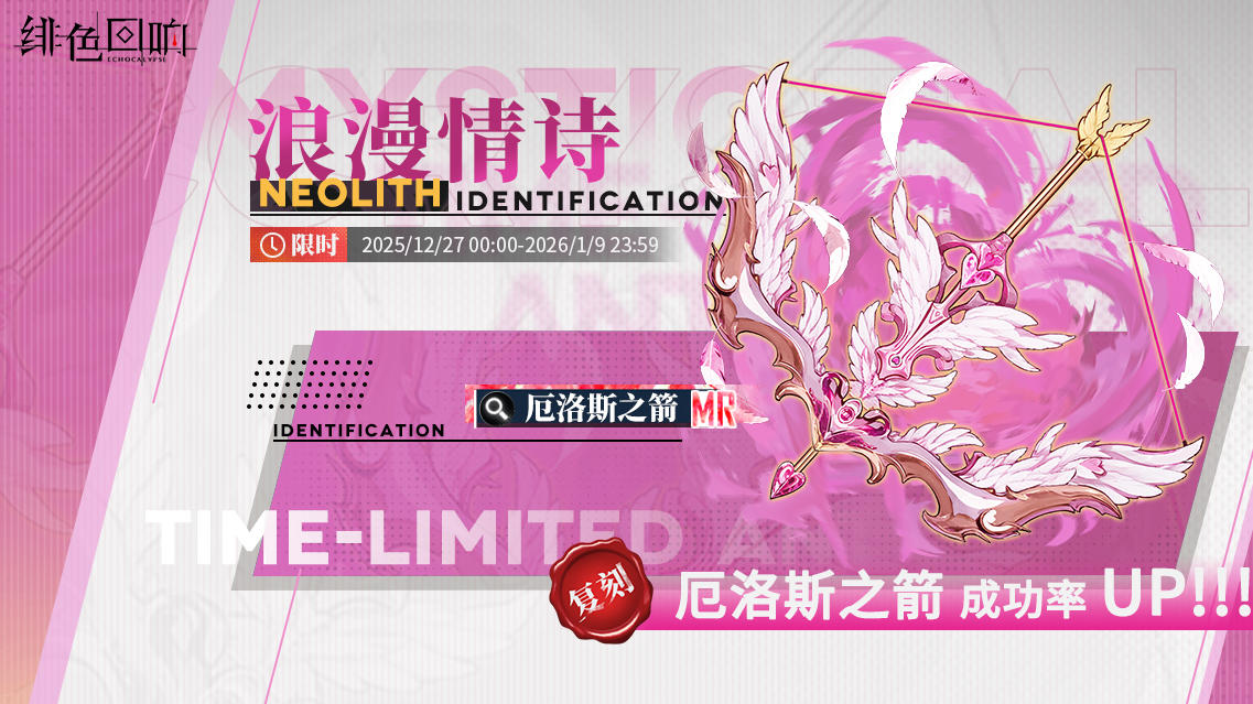 尊敬的唤醒者:「厄洛斯之箭」限时古物鉴定「浪漫情诗」即将开放!开放时间:2025年12月27日00:00 ~ 2026年1月9日23:59开放对象:权限等级 ≥ 25级※「浪漫情诗」限时古物鉴定结束后,「厄洛斯之箭」将暂时不会加入「古代晶珀」古物鉴定。唤醒者们在「浪漫情诗」中进行古物鉴定时,将有几率产出商店交换代币「虚时碎晶」,「虚时碎晶」可在限时商店「碎晶重组」中换取包括「厄洛斯之箭残
