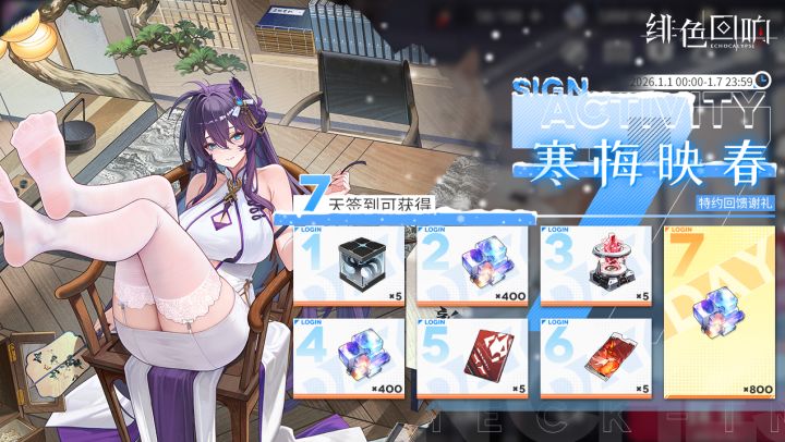 亲爱的唤醒者:为答谢各位唤醒者的支持与厚爱,7日签到活动「寒梅映春」将于2026年1月1日至2026年1月7日限时开启,活动期间可开启7日签到任务,此后签到满7日,即可获得5*「超源质」、5*「活体金属」、5*「鉴定申请书」、5*「扭蛋券」及1600*「钻石」的丰厚奖励!开放时间: 2026年1月1日00:00 ~ 2026年1月7日23:59※若在活动期间开启签到任务,唤醒者们需在2026