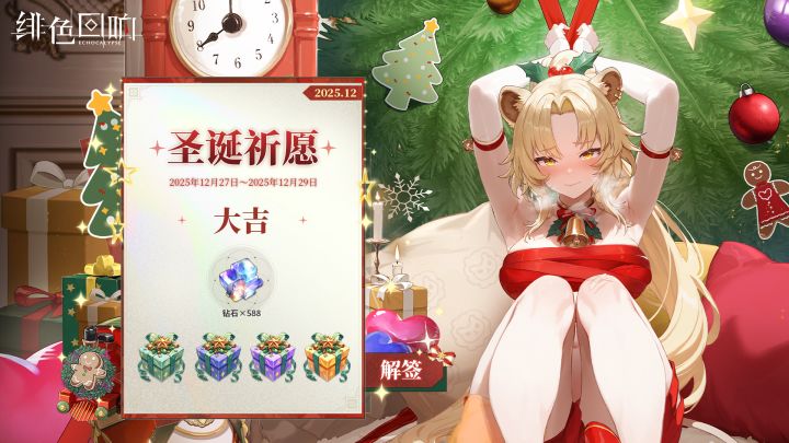 尊敬的各位唤醒者:活动「圣诞祈愿」即将限时开启!各位唤醒者每日登录后,将会获得一次「圣诞祈愿」祈愿的机会,根据每日抽签的结果,各位唤醒者将有机会获得「钻石」*320、「钻石」*400、「钻石」*500、「钻石」*588 等丰厚的奖励!同时,更有超值礼包供各位唤醒者选购!执起冬日的祈愿签,双节同庆,愿所有守护,皆得回响~快与各位共鸣者少女一起来祈愿吧!▼活动时间2025年12月27日00:0