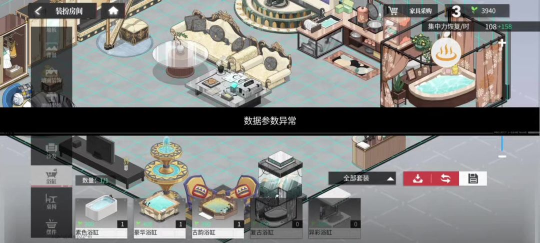 #绯色回响 今天买了新的宿舍浴池替换一下发现一替换就出现数据参数异常,然后我就把之前的东西都收了再摆也出现数据参数异常,弄得现在啥都不能摆放,我想问问还怎么玩。能不能赶紧修复一下,花了钱游戏还这样要不你把钱退给我吧。