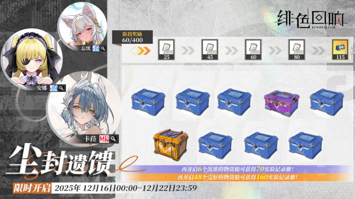特赖利克找到了一批被尘封的物资箱,它们来自回响水晶天灾肆虐的年代,或许可以补全现今回响水晶技术的一些空白。唤醒者们可以在「尘封遗馈」中参与资料兑换、活动补给、旧日商约等模块。消耗「陈旧钥匙」可以开启遗馈物资箱,获得「实验记录」或共鸣武装元件自选箱;消耗「物资管理卡」可以刷新当前轮次所有物资箱。开启物资箱达到一定次数,还可以领取额外阶段奖励哦!开启遗馈物资箱获得的「实验记录」可以在资料兑换中兑换