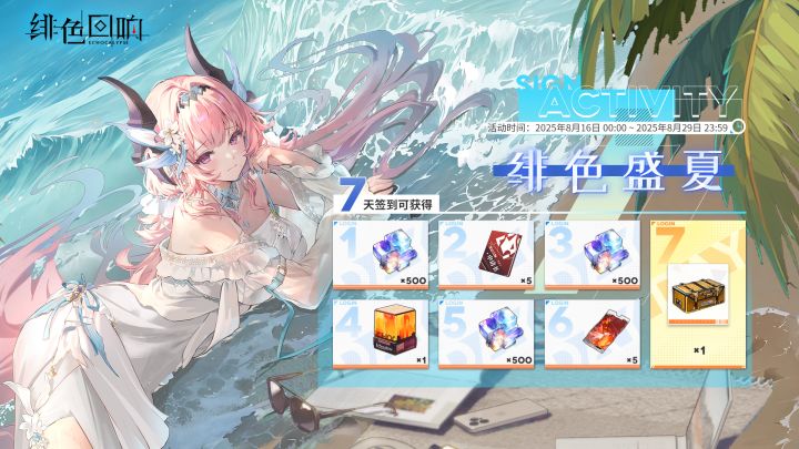 为答谢各位唤醒者的支持与厚爱,7日签到活动「绯色盛夏·下期」将于2025年8月16日至2025年8月29日限时开启,活动期间可开启7日签到任务,此后签到满7日,即可获得1500*「钻石」、5*「鉴定申请书」、5*「扭蛋券」、1*「SSR角色自选箱」以及1*「SSR角色时装自选箱」的丰厚奖励!▼开放时间: 2025年8月16日00:00~ 2025年8月29日23:59*若在活动期间开启签到任