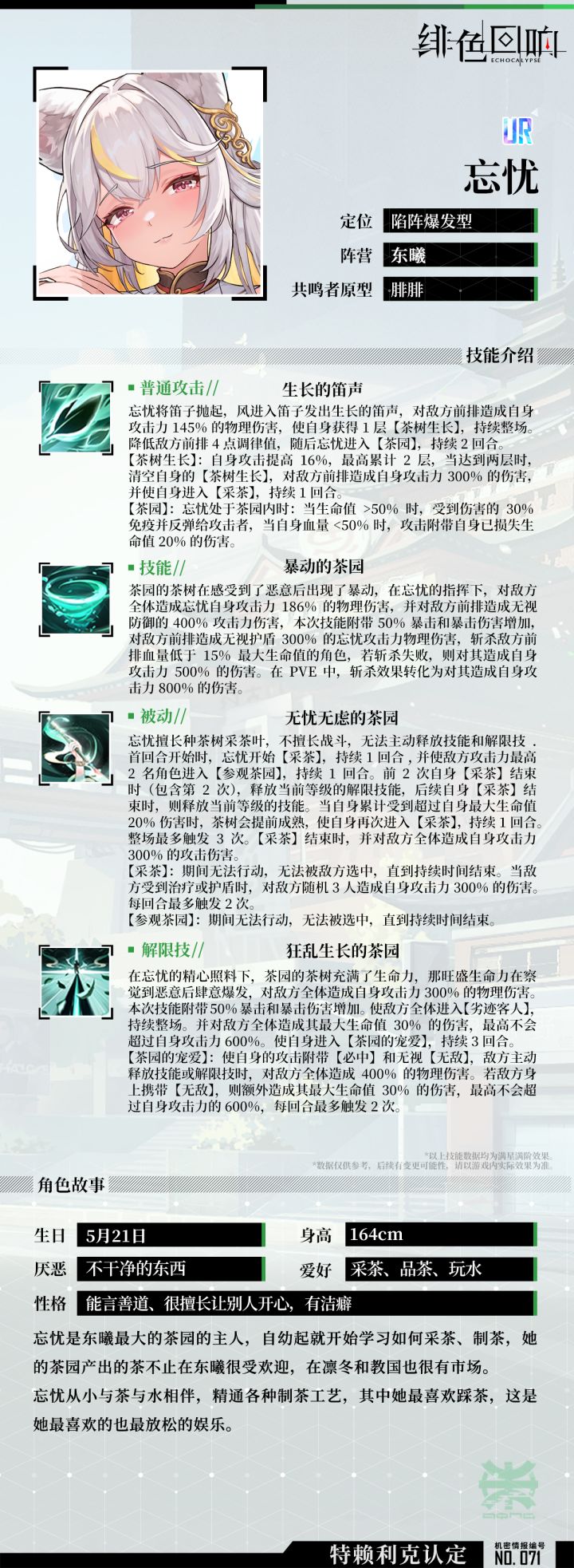唤醒者们好呀!今天的芬里尔专属栏目要为大家介绍的是——东曦最大茶园的主人「忘忧」(´ω`)「角色故事」 忘忧是东曦最大的茶园的主人,自幼起就开始学习如何采茶、制茶,她的茶园产出的茶不止在东曦很受欢迎,在凛冬和圣国也很有市场。忘忧从小与茶与水相伴,精通各种制茶工艺,其中她最喜欢踩茶,这是她最喜欢的也最放松的娱乐。「你对茶也很感兴趣吗?」