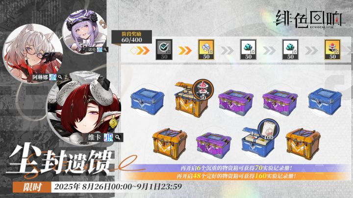 特赖利克找到了一批被尘封的物资箱,它们来自回响水晶天灾肆虐的年代,或许可以补全现今回响水晶技术的一些空白。唤醒者们可以在「尘封遗馈」中参与资料兑换、活动补给、旧日商约等模块。消耗「陈旧钥匙」可以开启遗馈物资箱,获得「实验记录」或共鸣武装元件自选箱;消耗「物资管理卡」可以刷新当前轮次所有物资箱。开启物资箱达到一定次数,还可以领取额外阶段奖励哦!开启遗馈物资箱获得的「实验记录」可以在资料兑换中兑换获得
