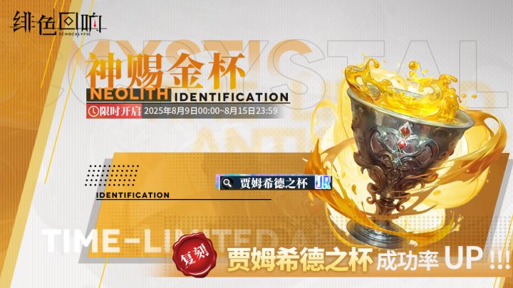 尊敬的唤醒者:「贾姆希德之杯」古物鉴定「神赐金杯」限时返场!▼ 开放时间:2025年8月9日00:00 ~ 2025年8月15日23:59▼ 开放对象:权限等级≥25级的唤醒者※「神赐金杯」活动结束后,「贾姆希德之杯」将暂时不会加入「古代晶珀」古物鉴定。