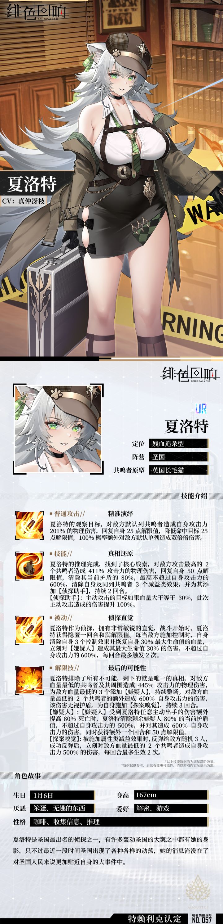 唤醒者们好呀!今天的芬里尔专属栏目要为大家介绍的是——圣国著名侦探「夏洛特」(´ω`)♪「角色故事」 夏洛特是圣国最出名的侦探之一,有许多轰动圣国的大案之中都有她的身影,只不过最近一段时间圣国出现了各种各样的动荡,她的消息淹没在了对圣国人民来说更加贴近自身的大事件中。没有工作的夏洛特非常的懒散,唯独对信息非常的敏感,她不主动出门,又好奇着外面的一切变化,报纸,线人,通讯器,杂志,所有包含