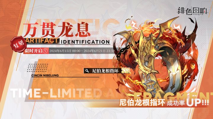 尊敬的唤醒者:「尼伯龙根指环」古物鉴定「万贯龙息」即将限时返场!▼开放时间:2024年6月15日 00:00 ~ 2024年6月21日 23:59▼开放对象:权限等级 ≥ 25级※「万贯龙息」限时古物鉴定结束后,「尼伯龙根指环」将暂时不会加入「古代晶珀」古物鉴定。感谢各位唤醒者对「绯色回响」的支持游戏中如遇到问题,欢迎随时与我们联系~通向诺纳亚大陆的大门已开启!让世界回归原本秩序,