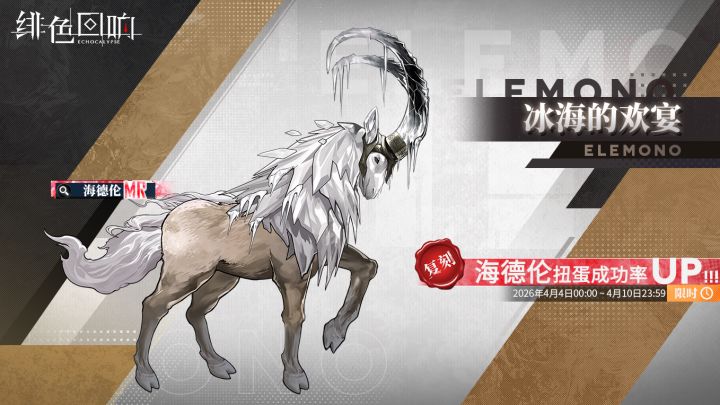尊敬的各位唤醒者:限时源质兽建构「冰海的欢宴」即将开放!「冰海的欢宴」开放期间,唤醒者们将有机会在扭蛋中抽取源质兽「海德伦」,源质兽「海德伦」可在战斗中召唤并协助唤醒者战斗,成为各位唤醒者的强大助力!开放时间:2026年4月4日 00:00 ~ 2026年4月10日 23:59 开放对象:权限等级 ≥ 60级※ 源质兽限时建构「冰海的欢宴」结束后,源质兽「海德伦」将不会加入源质兽建构「源