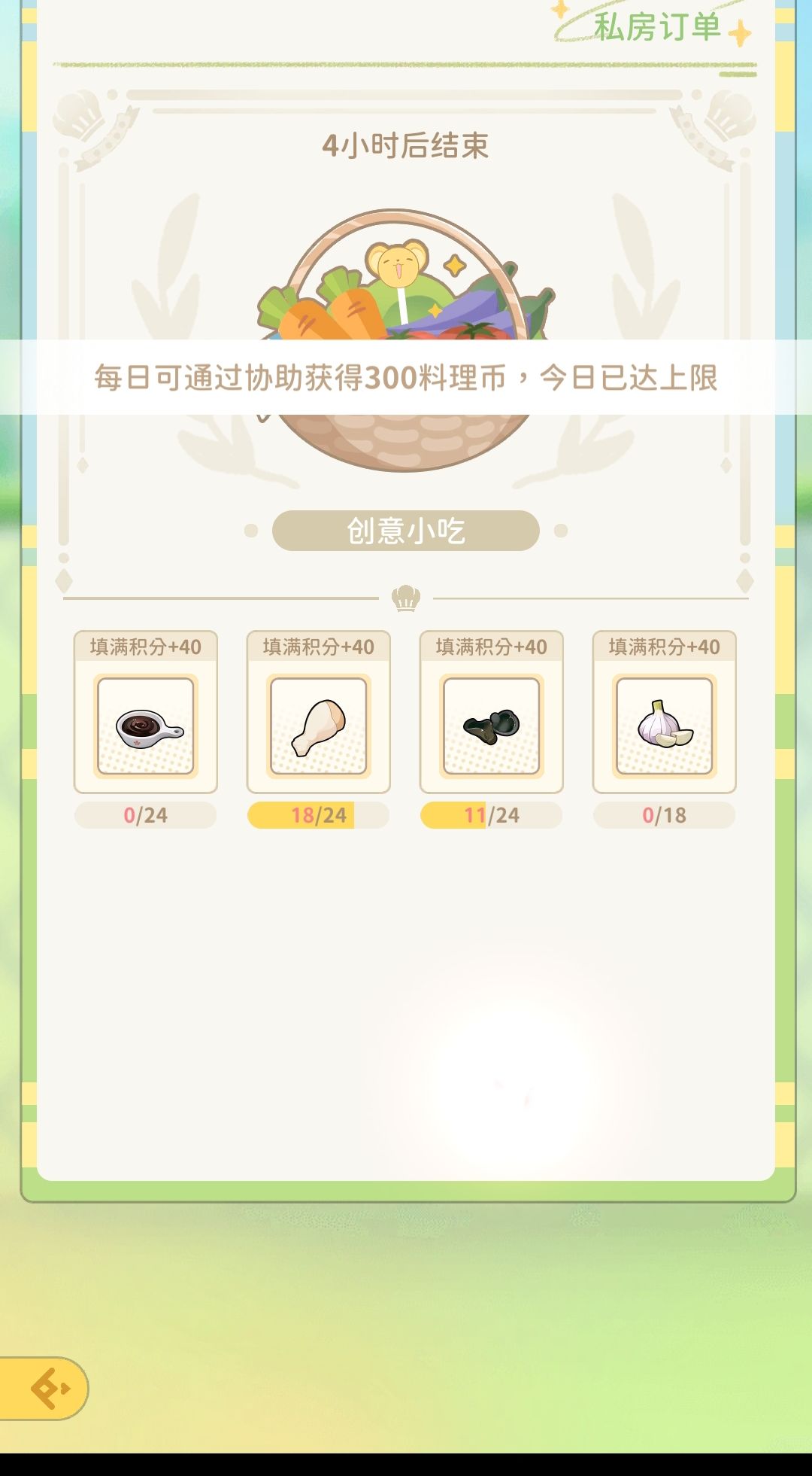 ①完成每日订单 会有300左右的币 ②协助私房菜 如果有人发出私房菜的协助申请,你有菜的话可以帮他都是会有币的,一天限制协助300(所以你可以再有三百币) ③私房菜 你发出协助收集四种菜(系统随机的) 注∶填满三种菜就是最高收益了,再填第四种纯粹浪费 奖励如下∶ 一级宝箱0-30,50币 二级宝箱30-60,100币 三级宝箱60-90,300币 四级宝箱90-120,600币 五级宝箱120--