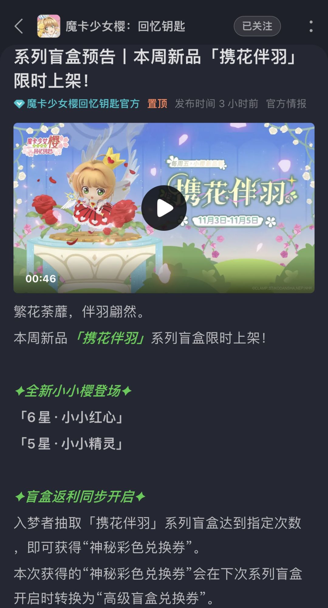 每周五新池子又来了 这周是携花伴羽 11月3日到11月5日哦 (图是官方视频就这么糊 尊嘟) 这周的活动有玩偶之家、普通池抽取以及小剧场 (希望这周能好好保底 尊嘟酸q🙏🏻)#魔卡少女樱回忆钥匙#游戏攻略#攻略#带着小樱去旅行