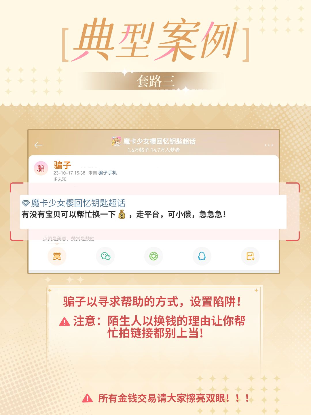 诈骗手段层出不穷,小芙继续给大家盘点诈骗案例! 以下素材都取自真实案例,入梦者们请引以为戒,提高防骗意识! 套路三:以需求帮助的方式设置陷阱,让玩家放松警惕! 套路四:发布高薪兼职,诱惑玩家上钩! 以上诈骗手段的帖子入梦者可以直接向平台举报,擦亮双眼,谨防诈骗#魔卡少女樱回忆钥匙