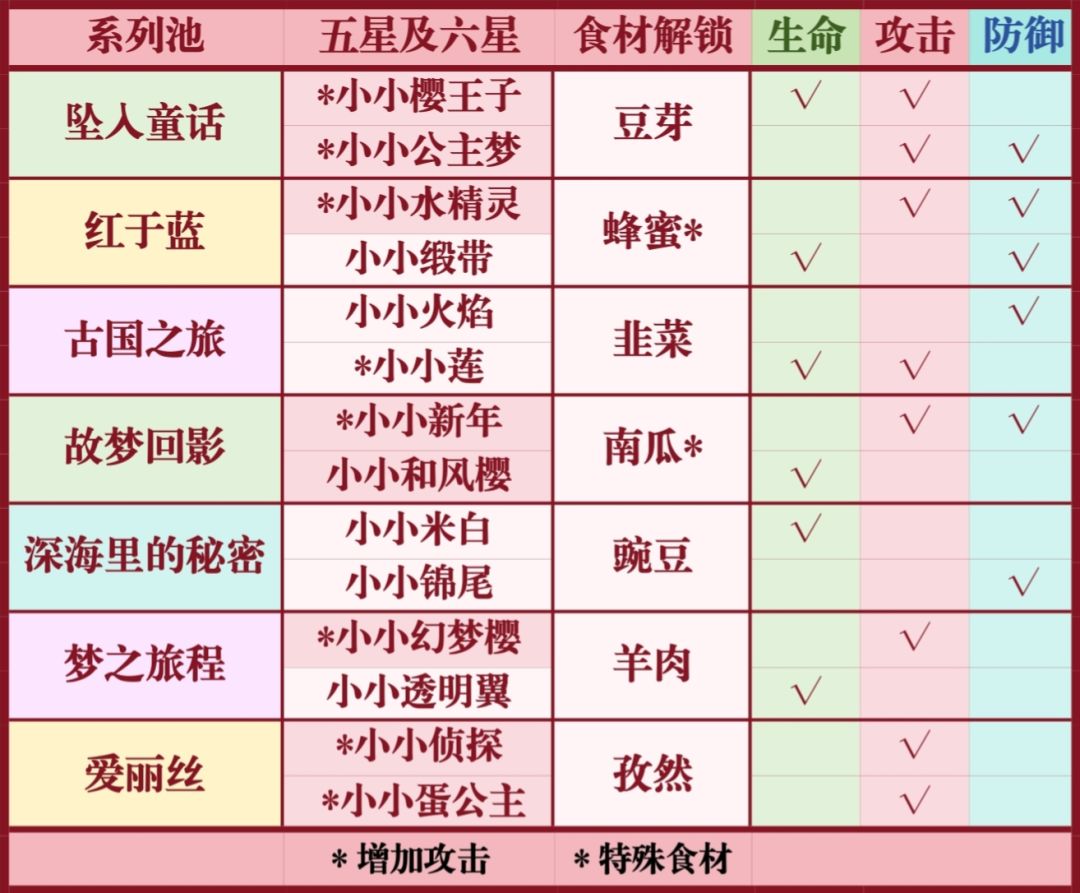 ♦️小樱攻击力的主要因素有: ①提升攻击属性的小小樱/小伙伴 ②购买家具提升属性 🔸家具的解锁与舞台的建造相关,随着舞台(26层)建造完成,家具购买也达到了上限。 🔸那么提升【攻击属性】的小小樱与小伙伴就显得更加重要。 🔸这里只考虑五六星小小樱及小伙伴的升级问题。(三星及四星的小小樱的合成与升级耗损资源较少,不考虑其优先级) 🌸【小小樱升级】 ⭐[限定池] ①[故梦回影] 🔸小小新年 ②梦之旅程 🔸