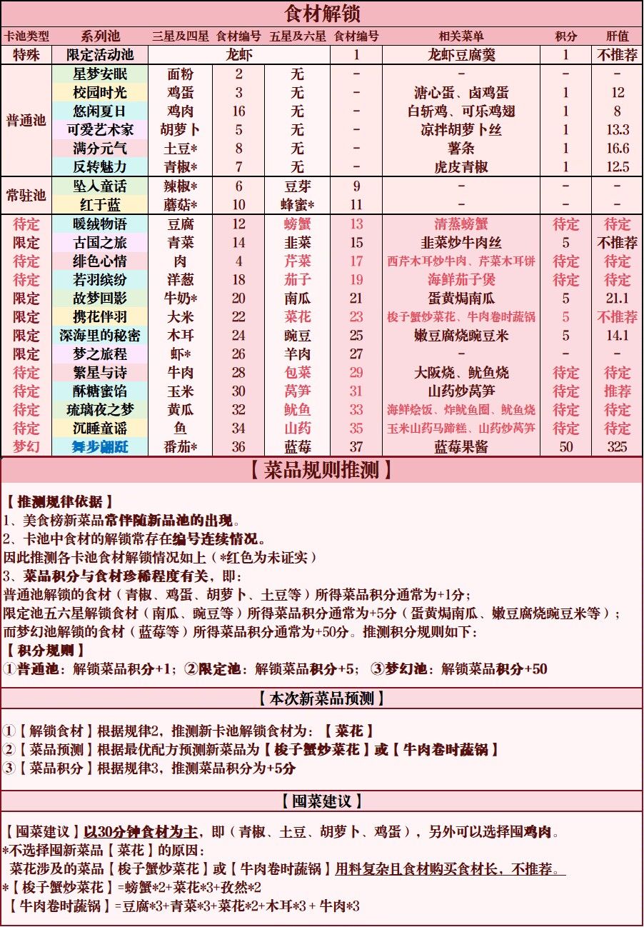 【本次新菜品预测】 ①【解锁食材】根据规律2,推测新卡池解锁食材为:【菜花】 ②【菜品预测】根据最优配方预测新菜品为【梭子蟹炒菜花】或【牛肉卷时蔬锅】 ③【菜品积分】根据规律3,推测菜品积分为+5分 【囤菜建议】 【囤菜建议】以30分钟食材为主,即(青椒、土豆、胡萝卜、鸡蛋),另外可以选择囤鸡肉。 *不选择囤新菜品【菜花】的原因: 菜花涉及的菜品【梭子蟹炒菜花】或【牛肉卷时蔬锅】用料复杂且食材