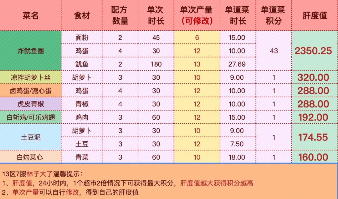 1月5日美食赛肝度值计算已经更新,每周都会更新,想要拿到最新情报,可以收藏此帖哦! 肝度值:即是24小时内,1个超市2倍在情况下可获得最大积分,肝度值越大获得积分越高 美食赛肝度计算文档 PS:计算公式都写好了,各位玩家可以自行修改每道菜食材的产量,会自动生成各位的肝度值