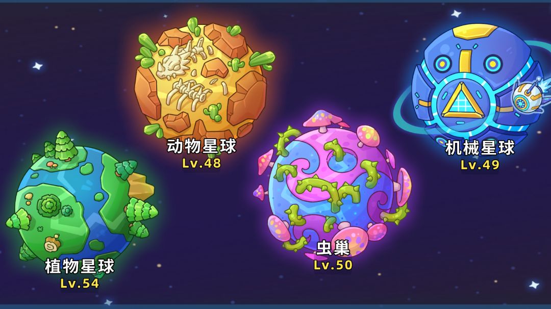 #新游试玩节 探索星球 游戏采用关卡制,每个星球为一个大章节,星球中有很多小的关卡。玩家操控飞船前往不同星球探索,每个星球都有独特地形和资源。 资源收集与管理 在探索过程中可收集水、蔬菜、矿石、土、木材等资源。星球能量随机产生一种资源,通关关卡和完成任务可获得能量。水和肉是生成动植物卡牌的关键资源,其他资源是制作盖娅核心(各种建筑)的材料。 基地建设 玩家可在受损的飞船上建设家园,