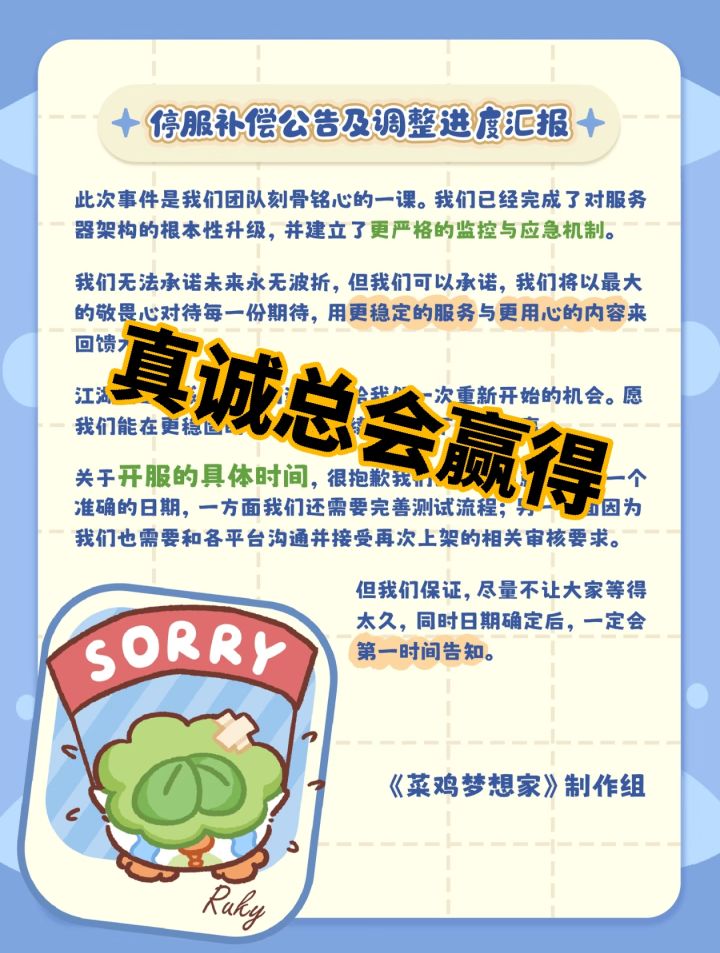 这次官方是真·听劝!不仅火速修复Bug,还用实打实的福利回馈所有玩家,没有套路不搞限额🌟 全服补偿福利✅️菜菜臻享卡」大月卡×1:30天专属权益直接到账,累计可领4160红果+每日限定福利,助力驿站经营无忧!✅️两套主题服装套间:「青鸾云栖」全套配置+「绮梦洛可可」主题套间(含雪景屋顶),两套套间内所有家具与摆件均为双倍发放,打造专属梦幻空间!✅️限定互动家居:独家定制「赔罪菜鸡」「鞠躬