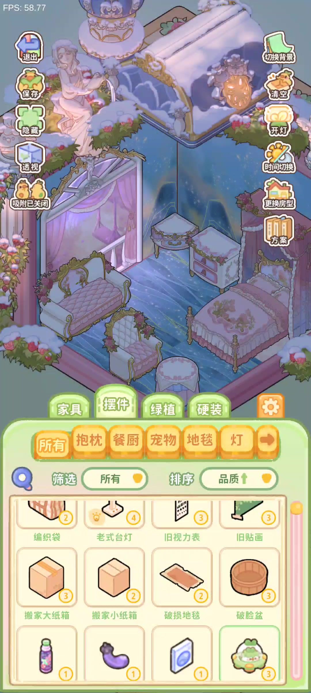穿模这种bug问题已经及时游戏中反馈了。说一说玩下来的感受1.画面太糊,小摆件长啥样都看不清。升级以后的奖励页面,只能大概看到奖励什么,具体是什么东西很糊,也不能点开详情页。2.很多物品不知道具体是什么作用的,比如玻璃屏,详情页也没有说明,只有风格介绍作者介绍是完全不够的,介绍应该写清楚这个东西是个什么东西,作用是什么吧。3.物品分类很奇怪,厨房的就是厨房的,浴室的就是浴室的,柜子就是柜子,