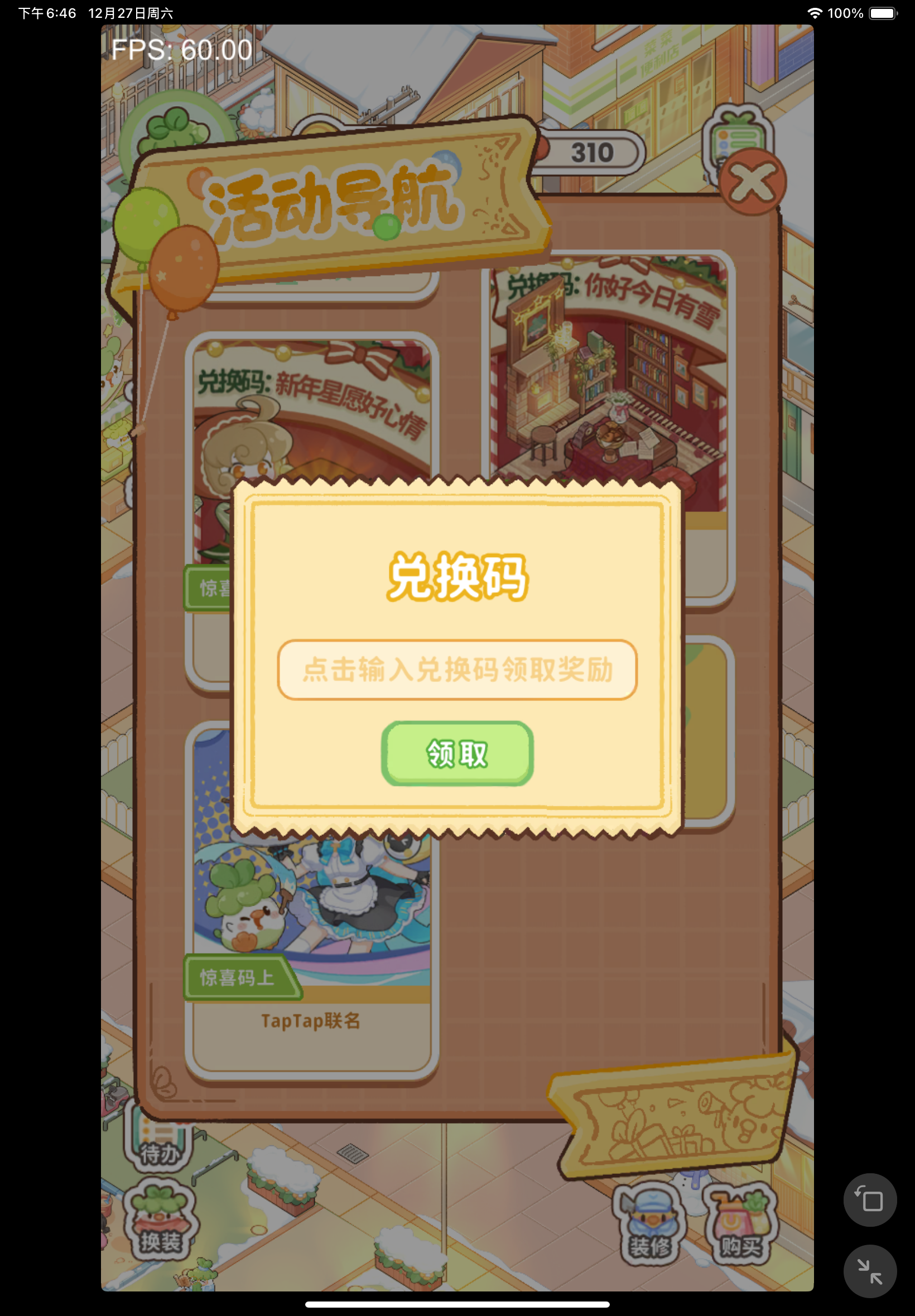 紧急维护了找点事做,后续的也会在这里面更新ruky555 ruky666 ruky888 温居赏雪意悠然 (限时)菜鸡梦想家有雪景 (限时)出来吧圣诞树 新年星愿好心情 你好今日有雪 —————————————————————看到论坛里的几个问题也顺便回答一下:tap联名在10级以后解锁街区,有联名任务,做完就能获取了主线任务的“鸡窝”和“帐篷”都是“摆件”,等级够了就能解