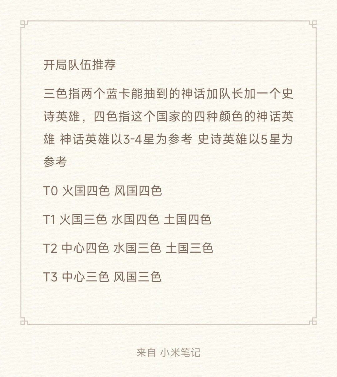 什么英雄强?要不要刷初始?初始刷什么? 新玩家问的最多的三个问题,我游在前中期的强度不看单个英雄,看哪个国家。玩家入坑后的第一目标就是凑齐一个国家队(同一个国家的四色神话英雄,前期需要三色神话加一个史诗过渡),而这个国家队可以一直用到弃坑。所以单个英雄的强度毫无意义,他所在的国家队强度才有意义。以下是个人见解,仅供参考。 三色指两个蓝卡能抽到的神话加神话队长加一个史诗英雄,四色指这个国家的四种颜色