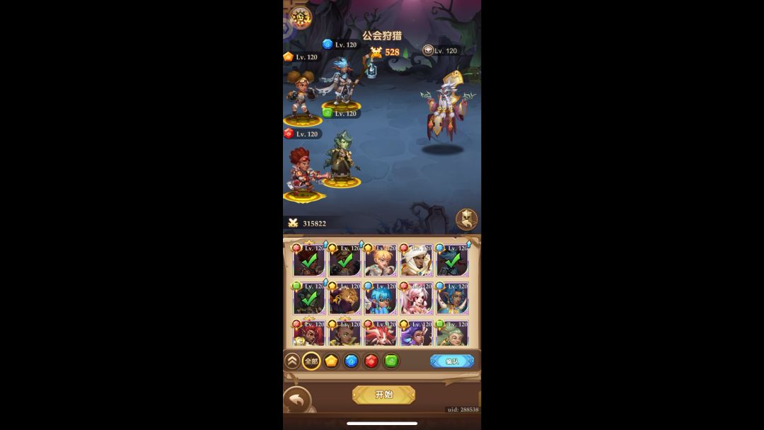 公会狩猎要想打出伤害: (1)一个是活的久, (2)一个是要有给力的输出英雄和棋盘, 活的久就需要能够将公会boss晕住,减少其攻击的频率,所以选择带有晕眩效果的辅助伶,为了提高晕眩的概率,尽可能的提高伶的星数,我的伶是通过攒300抽,在up池一次性抽到六星。 伶确定后,根据国家搭配,可能直接风国伶,白,禅,倜。但是伶的存在能够将公会boss晕住,大大提高了存活率,所以没有选择禅,而是选择了贝