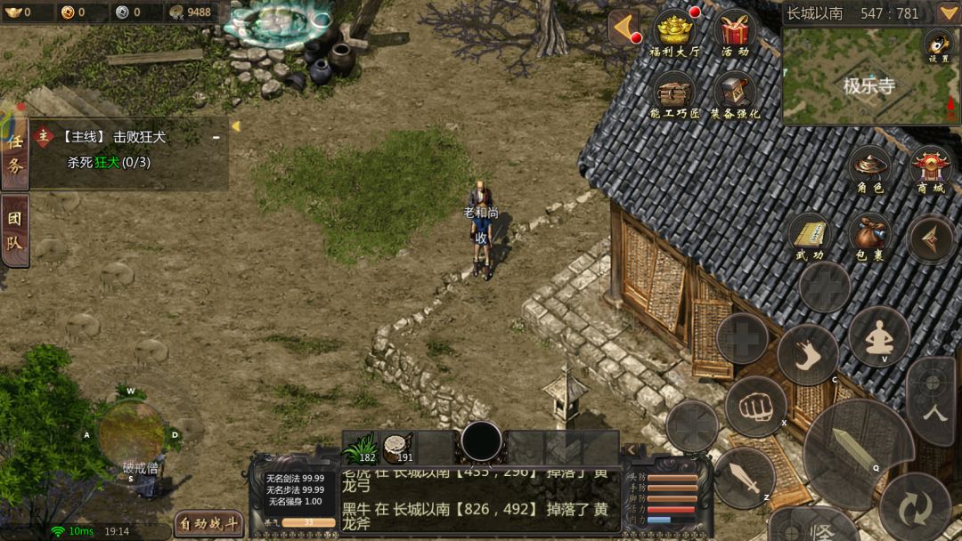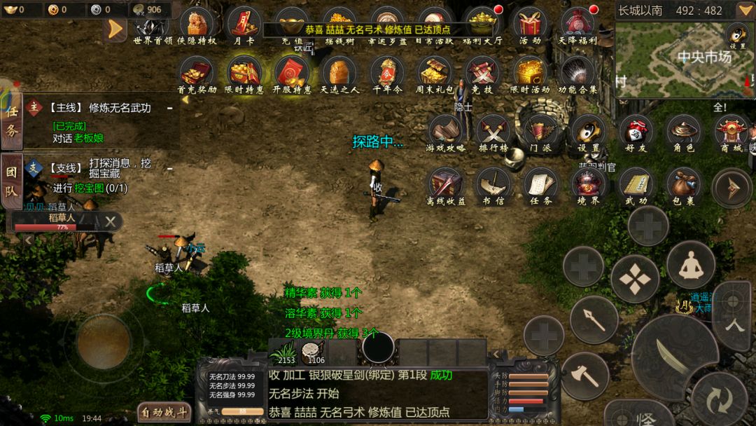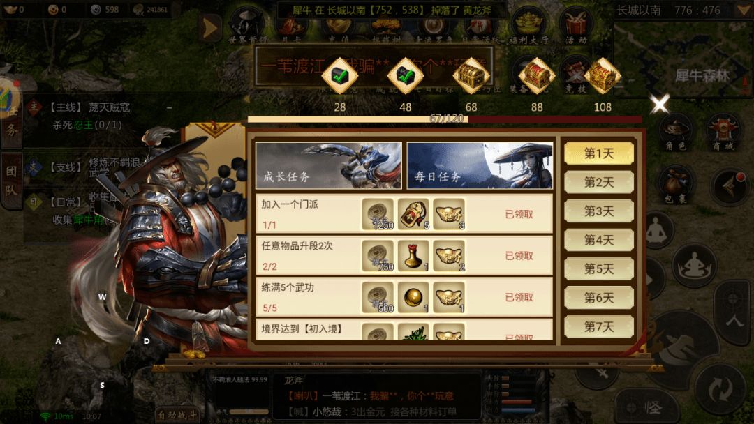 玩家在进入游戏后所在地图位置是【新手村】,通过新手指引来学会如何使用武功、药品,根据任务来到长城以南,到达后玩家可以继续通过主线任务学习如何购买技能书和基础的武功修炼,完成主线任务可以直接获得黄龙、王陵装备。 在主线中碰到一些比较强劲的怪物或是一些会主动攻击的怪物(例如老虎、流氓等等)可以学习远程的武学,将怪物拉出一点距离然后击败。 开通月卡后击败的所有怪物都有概率掉落银元,银元可以兑换成金元,银