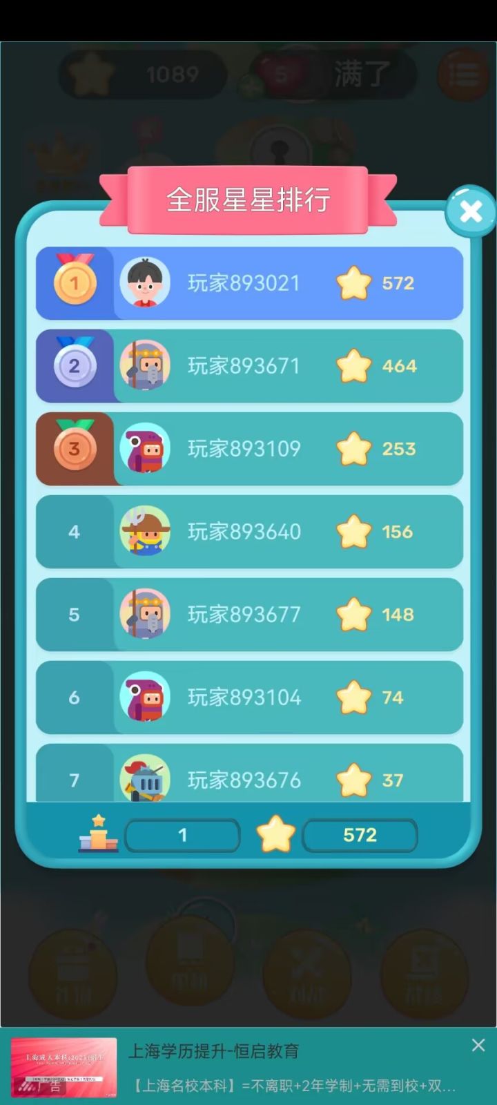 【新功能】全服星星排行上线~单机超过10关可以在单机页面进入,会收录所有的单机关卡所产生的星星容我先偷个塔!!!!!