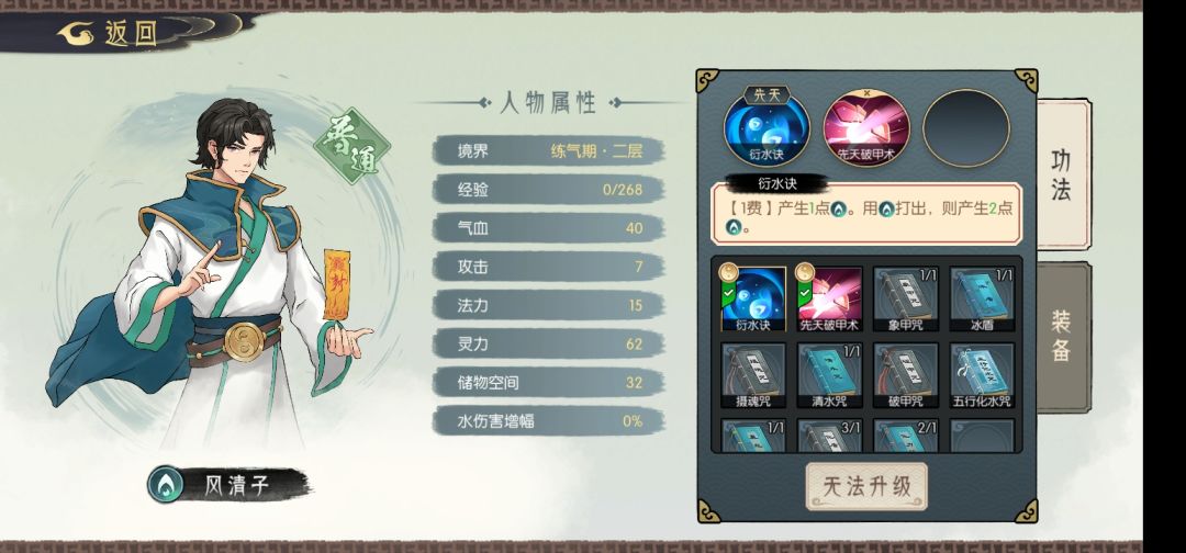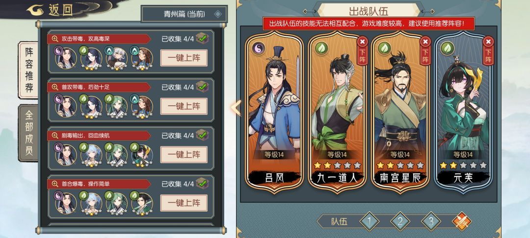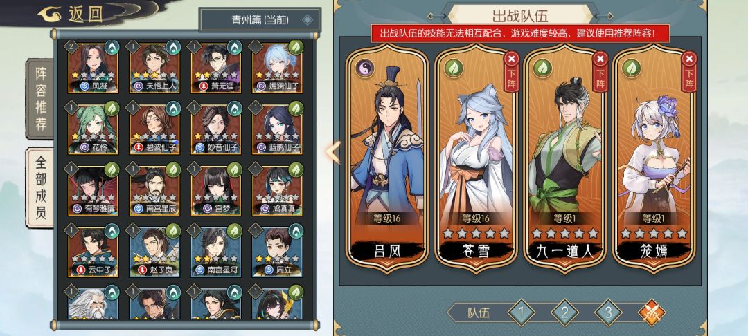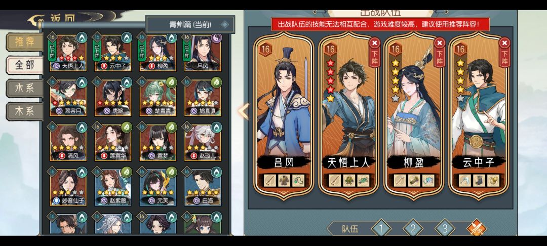 我的阵容就是第一关初始三兄弟,打过第一关之后进第二关之前是初始四兄弟,功法也是初始功法, 进第三关之进第三关之前做了一点优化,换了主角的两个功法, 第三关通了之后我到现在为止也没有刻意的去升修为,一个筑基都没有,全靠送的材料,还有交易过来的材料和丹药,目前等级是周立十层,主角小师妹六层,风清子二层 上配置图 后续阵容调整,我依然会放在这里 这是进第四图时候我的配置 首先我得承认这个游戏是小众游戏