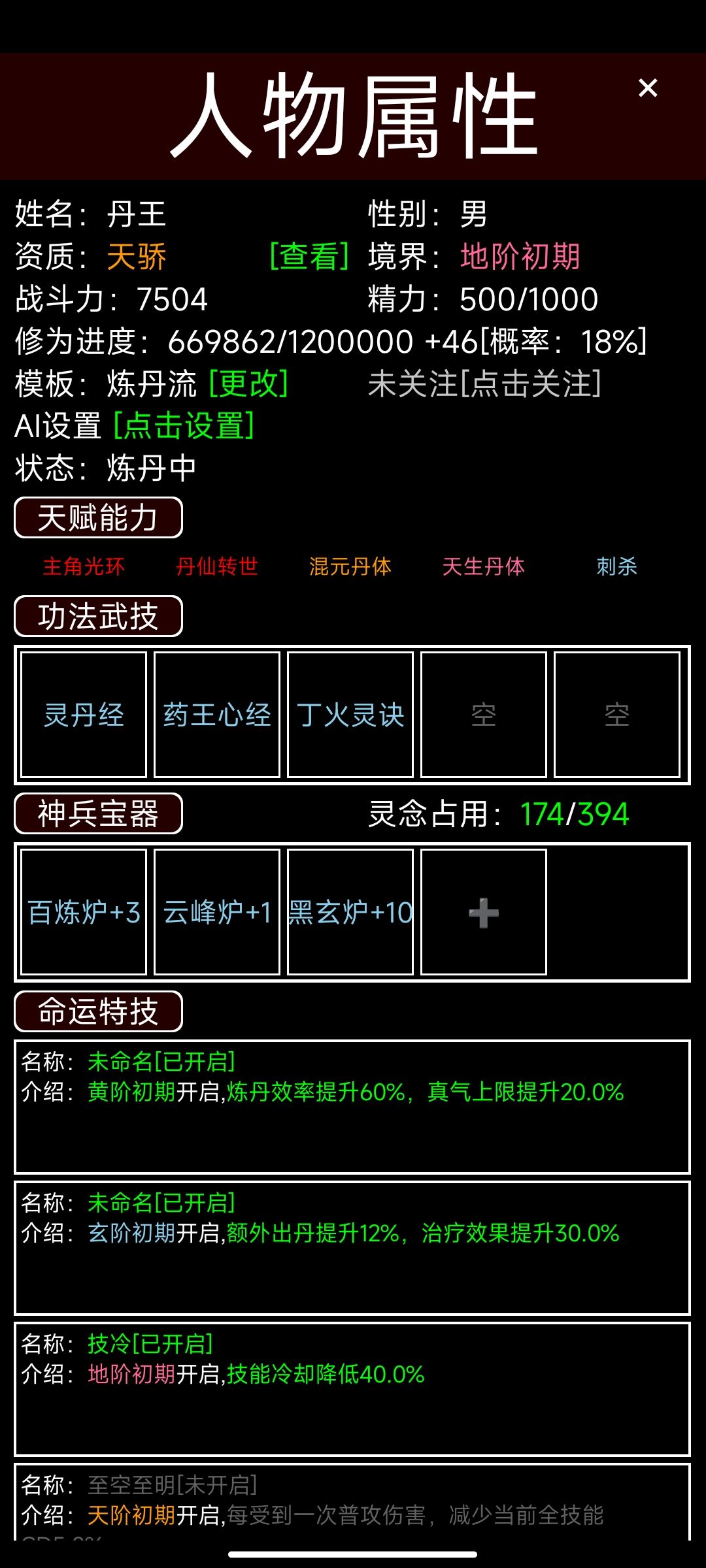 朋友们,距离昨天发布的攻略,一天时间,昨天的二流帮派的100个成员已有99个上地阶了。看了这个结果,大家应该更明确的看到炼丹开局的速度了,挂机一天,平均等级肯定是没有这么快了。 今天来说一说中后期的攻略 1.这时候主角可以关了自动交易就打开自动炼丹。把所有炼丹材料全吃了,丢给主角让一直炼,然后过来没收就可以了,当然他会自己休息的。 2.这一波下来,市场上的丹药都完善了,包括属性丹,如果想赚钱就挂满