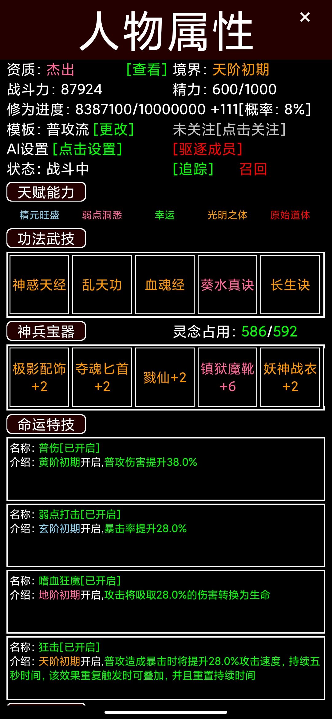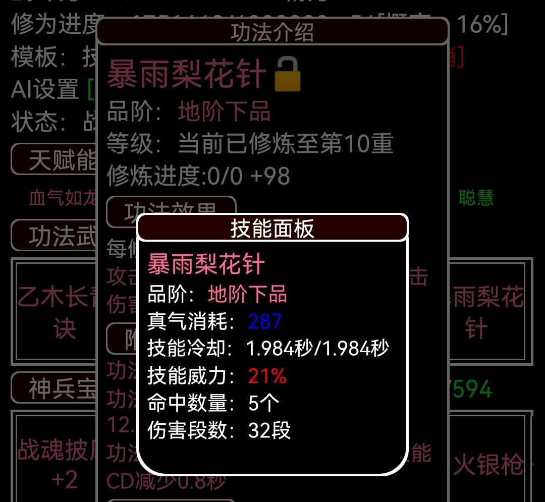 萌新攻略 1.开局随机随什么?主角光环是固定的,剩下的还有命运特技几个随机词条,最好选择输出类的,目前来说最重要的灵念,灵念影响后期可装备的数量,装备会带很多孔,高灵念会对低灵念形成面板碾压。 2.玩什么流派?普攻技能还是通用,还是归结于灵念,能找个灵念高的随便玩啥流都伤害爆炸。 3.酒馆可以卡最后几秒存档进行sl,愿意sl可以刷天骄,但概率低得离谱。同理愿意sl可以突破大部分境界。 4.炼丹有突