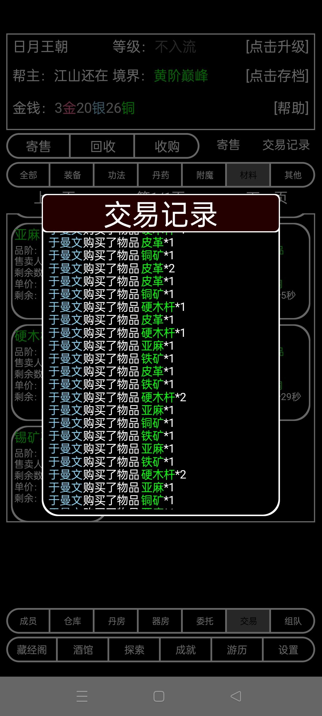 已知成员会把无用的东西寄售,半小时无人购买就会进入回收栏,再过4小时后就会被半价回收,同时也可以由玩家主动购买。 炼丹师会主动购买对应等级的炼丹材料 炼器师会主动购买对应等级的炼器材料 【工具人——材料商】 准备一个有钱的npc,将流派切换成炼丹(炼器)并关闭自动炼丹炼器,之后会在下一次交易内购买对应材料。收购完毕后切换其他流派,便会将自身的材料进行抛售,这时就可以将这些材料一口气吃进来。 建筑材