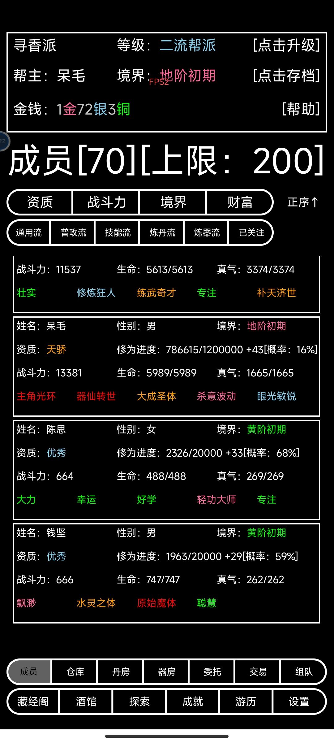一、弟子选择 杰出,天骄弟子无脑选,这是没有任何疑问的。但是废材,平庸,优秀弟子该如何选,这是值得斟酌的。 弟子全靠酒馆招募,一是两小时自动刷新,二是花钱(一次加50银,极限50金),三是广告。 帮派人口没满之前,弟子能招就招,满了之后再精心挑选弟子。 废材弟子没天赋,可以直接略过。 平庸,优秀弟子出现的频率最高,作用也很直接【工具人】,如何挑选工具人,这值得讲究。 工具人的作用只有两个,一是赚钱