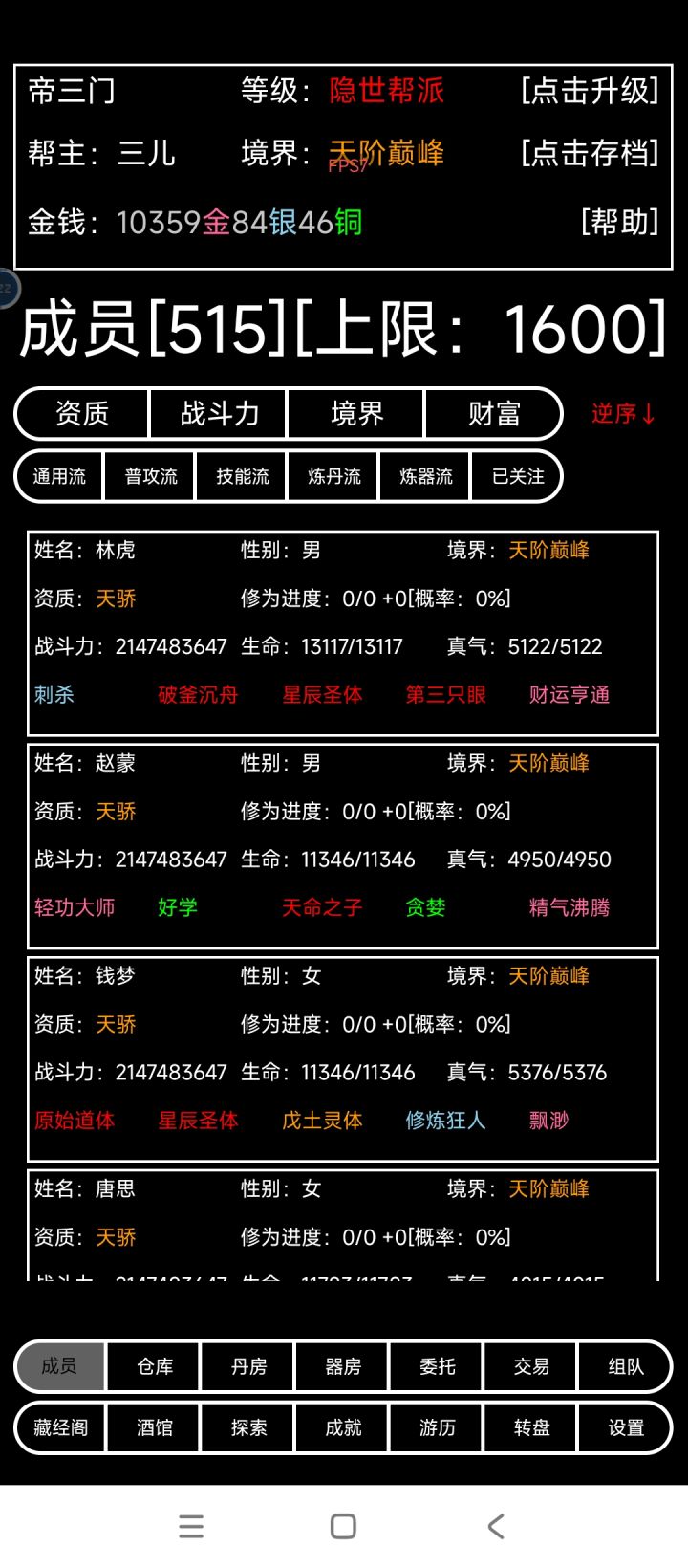 一、弟子选择杰出,天骄弟子无脑选,这是没有任何疑问的。但是废材,平庸,优秀弟子该如何选,这是值得斟酌的。弟子全靠酒馆招募,一是两小时自动刷新,二是花钱(一次加50银,极限50金),三是广告。帮派人口没满之前,弟子能招就招,满了之后再精心挑选弟子。废材弟子没天赋,可以直接略过。平庸,优秀弟子出现的频率最高,作用也很直接【工具人】,如何挑选工具人,这值得讲究。工具人的作用只有两个,一是赚钱