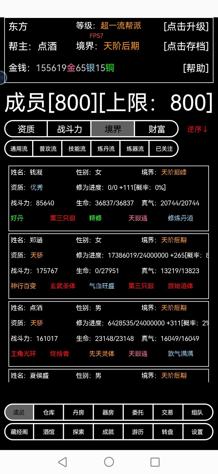 开局主角选择,带一个丹类的丹仙,和岐黄大师最佳,主要成丹数和成功率(同样的材料多几颗丹药,多挣钱),然后收集材料给主角练炼丹等级,前期没有等级随便怼,后期尽量只炼满成功率的,低收材料,高价卖丹药,成员买了丹药加属性=加战力,多赢,然后花钱收集功法,1铜让成员学,战力基本涨得很快,酒馆,人字号,能便宜就便宜,其余的能多高就多高,其他的暂时想不到啥补充的
