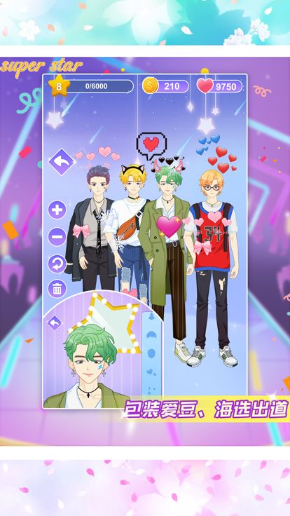 有史以来最好的爱豆偶像模拟游戏!管理自己的爱豆偶像公司!您将成为偶像男团的制作人。从世界各地选择心仪的男团练习生。花重金包装男团练习生,选择发型,头发颜色,隐形眼镜,帽子,项链,耳环,脸部贴纸,服装等。在您的支持下赢得出道选秀大赛!!