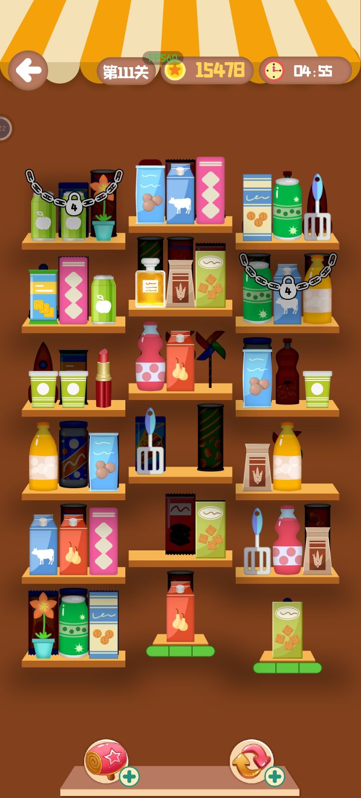游戏简约简单,基本一共就我截图的这三个界面,在时间内把货架三消清空为过关。