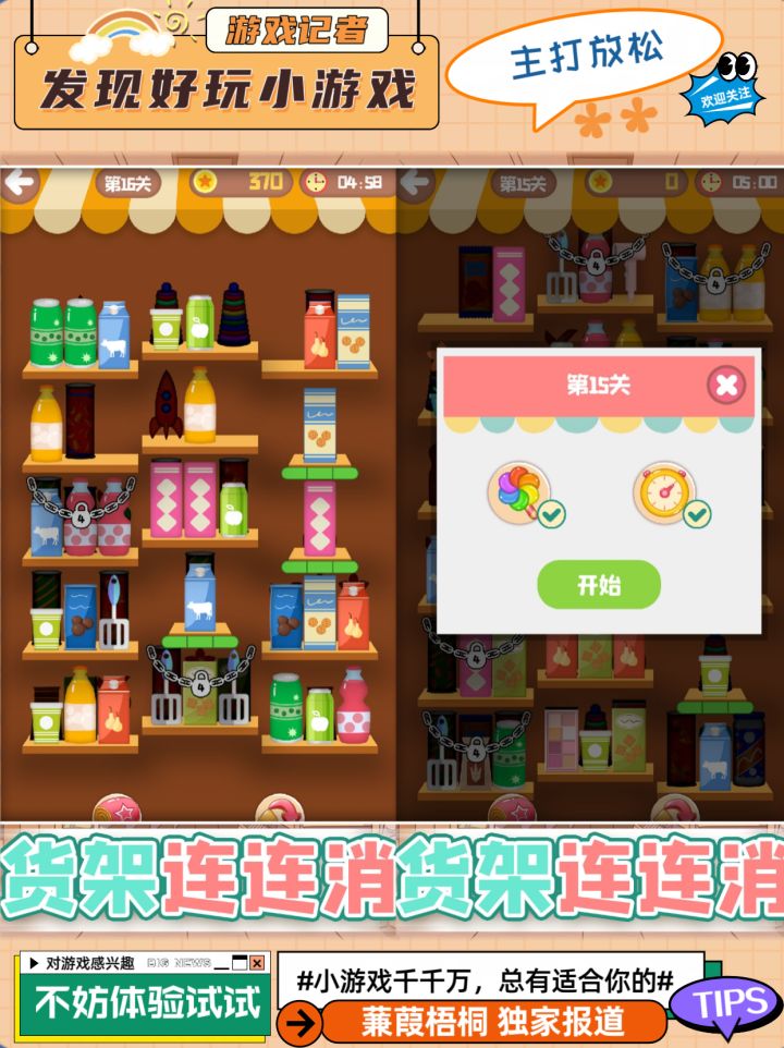 🎮 游戏名字:货架连连消🔍 游戏类型:益智+消除+休闲✅ 游戏状态:目前已上线!下载即可体验!🌈🌈🌈🌈🌈这是一款有趣的超市货架三消游戏,游戏中需要将三个相同的物品放置到一起即可消除,游戏还有多种道具可以帮助通关,游戏关卡的难度也会随着关卡的推进变的越来越高,欢迎来挑战!✨✨✨✨✨——💞💞简介无力,欢迎亲自入坑体验!#TapTap年度游戏大赏应援 #游戏推荐 #游戏安利