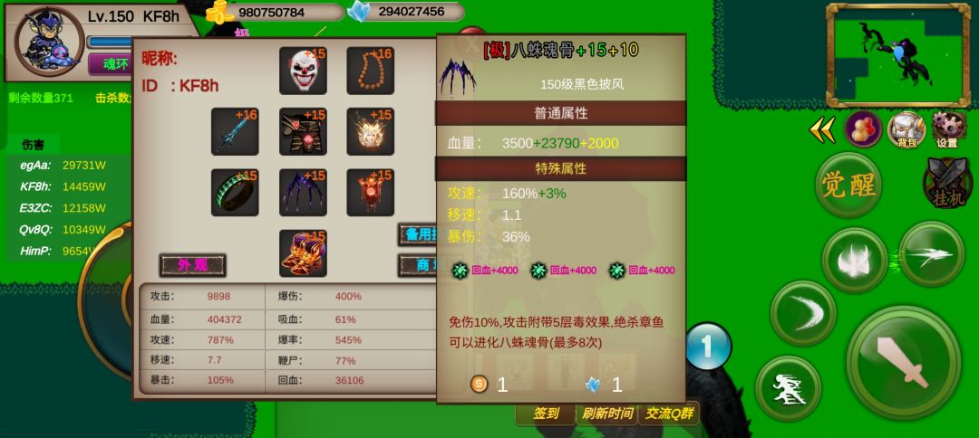 qq:839686768 欢迎各位萌新加入我们,一起玩,一起交流。 游戏开局先把免费的礼包码用了 123456789(自动拾取和卖出,金币1W,10强化卷等) 1987654321(快捷栏+2,10强化卷*5,黑色武器-斩杀) mmy520(boss结晶,灵魂各1W) mmy666(黑色鞋子-充能战靴和黑色武器-橙光) mmy888(13强化卷*2) 宠物(自己id+66) 开启主线任务([表情_菜]