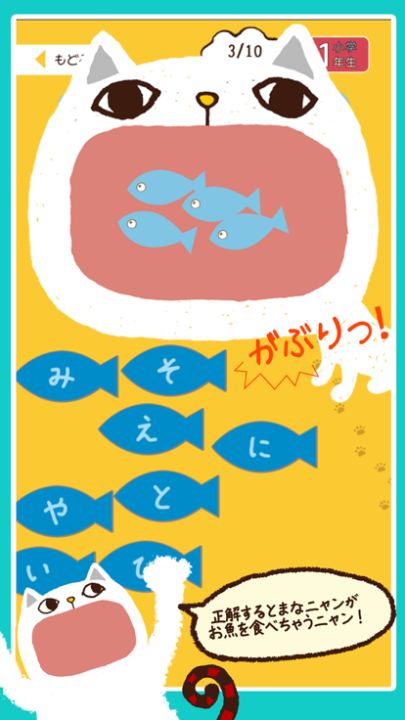 メニューは学年ごとに分かれていて、1回につき10問を出題。1問ずつ出される漢字の読みがなを、魚に書かれた文字から選びます。正解の場合はまなニャンが魚を食べることができて満足、不正解の場合はちょっと不機嫌です。1問につき10秒の持ち時間内で答えましょう。時間は並んだ鈴が知らせてくれます。
