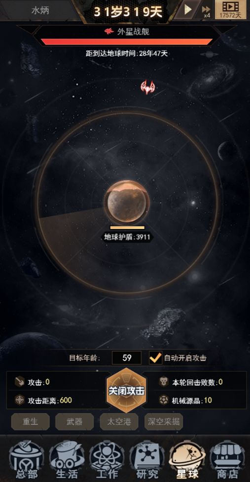 当前游戏的主线是抵御入侵者,守卫星球。面临源源不断的敌人入侵,只有击退入侵者,我们才能活下去。生存时间榜单,本质上就是单轮回击退敌人数量榜单。但其中其实还是有些技巧。在前期,我们没有解锁星球功能时,是看不到敌人入侵的。但这并不代表敌人没有入侵。有些玩家不研究【深空探测】解锁星球功能,以为这样就能不战斗,这样的想法是不对的。敌人大概从我们20岁就会入侵,到60岁左右就会开始攻击星球,如果没有解锁