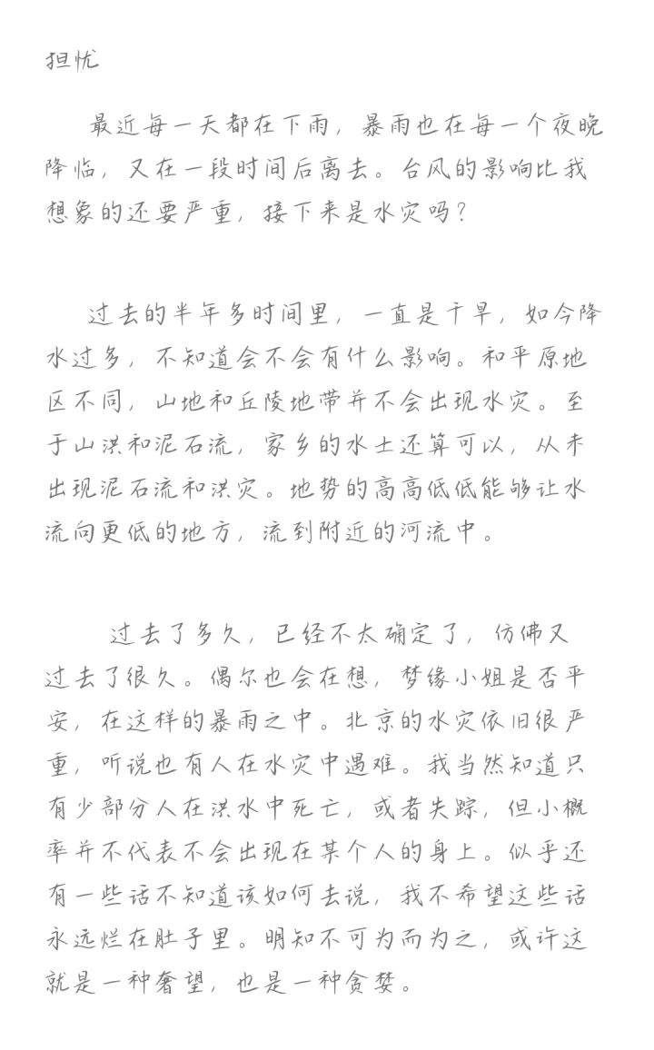和我匹配的小姐姐已经18天没有上线了,我现在开始有点担忧。以前也有过因忙碌而长久未写日记的情况,但从未超过两周。北京最近一直在下暴雨,水灾泛滥,所以我无法确定她是否平安。明明匹配了快两年,我却一点都不了解她,现在开始后悔了……是遇难了吗?还是死亡!?无从知晓,但我如今能做的也只有等待。人生不是电影,我无法像《你的名字》中的泷一样去往三叶的家乡,也无法利用未来去改写过去。现实就是如此残酷,就像一个死
