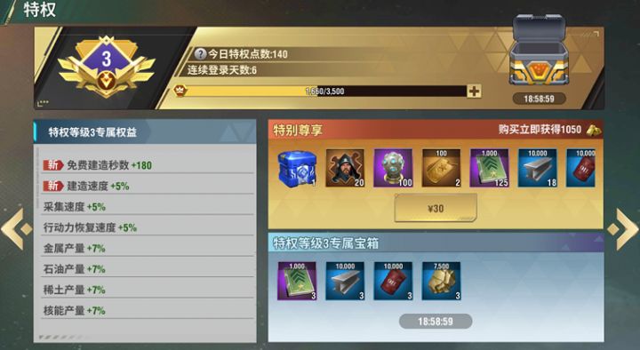 各位尊敬的指挥官大家好,今天给大家带来王牌装甲师VIP特权的介绍~王牌装甲师的特权等级是免费赠送给各位指挥官的~下面就给大家详细介绍一下特权等级的作用和升级方式~【特权介绍及升级方式】特权在特权界面内玩家可以查看自己的特权等级、特权增益、领取每日宝箱。入口:点击头像下方VIP进入特权界面。提升特权等级的意义提升特权等级可解锁更多专属权益,提高建造速度,研究速度,采集速度等等。购买