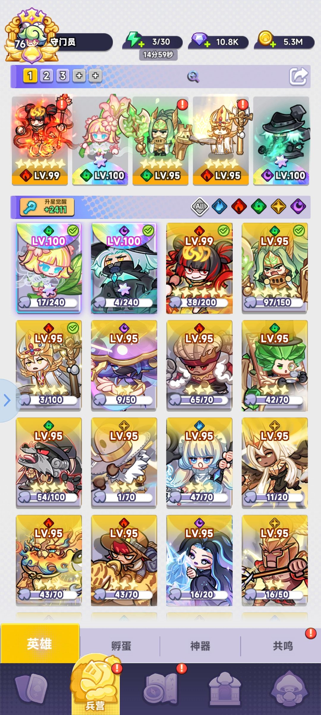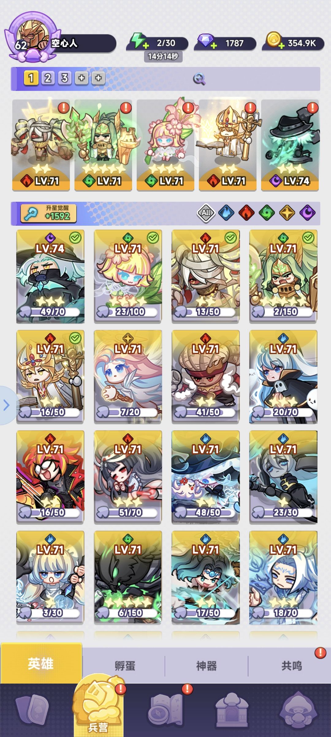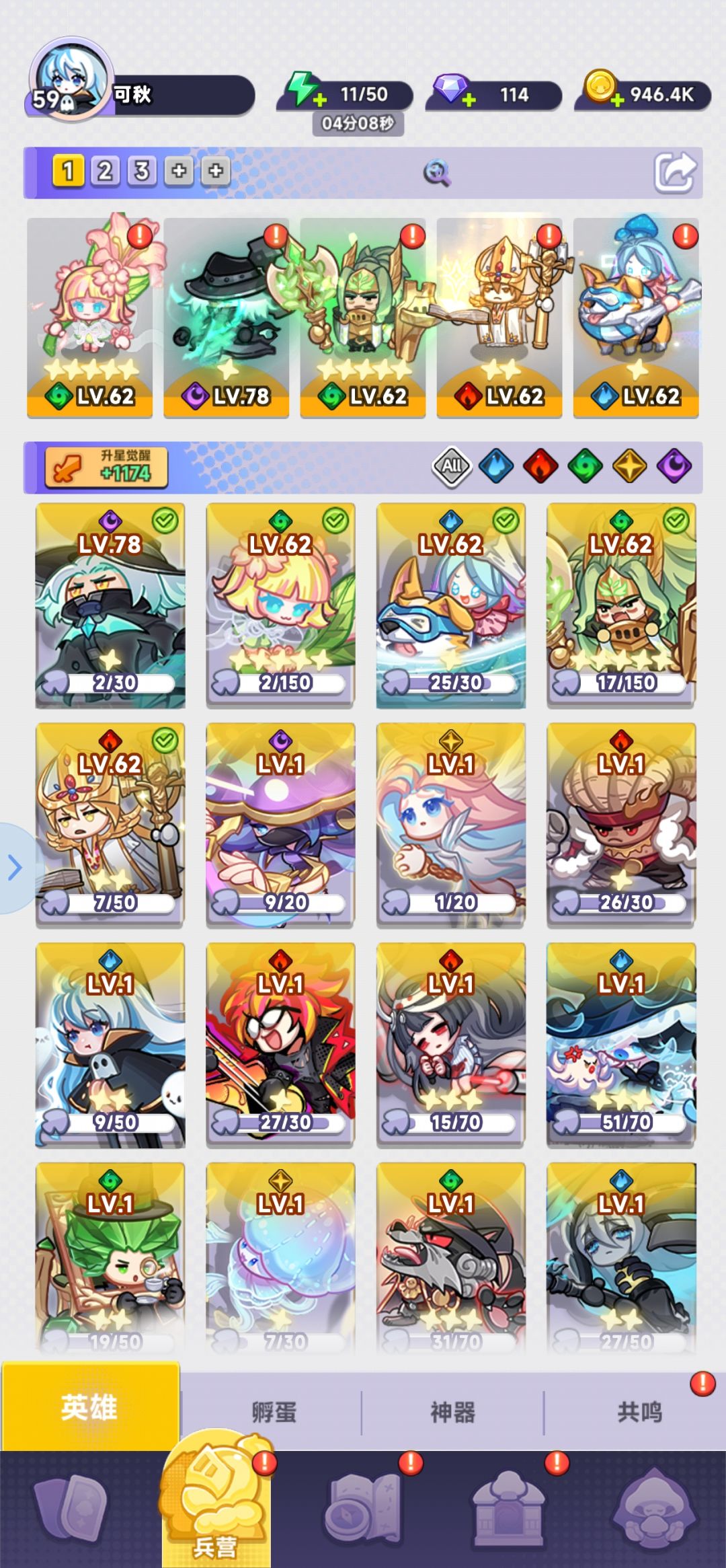 第一个死神在5以前不要和,6合一个金,8合彩,在10时两个金色一个彩星,14时2彩,18时3死神,第四个随缘(我这里的第四个装备没有等级不高,伤害可有可无) 火辅尽量在14时有6个,别的角色除了能同时加2死神或者开矿,直接卖。 除了死神火辅,那3个凑4水,以及有4个加成位置才带的