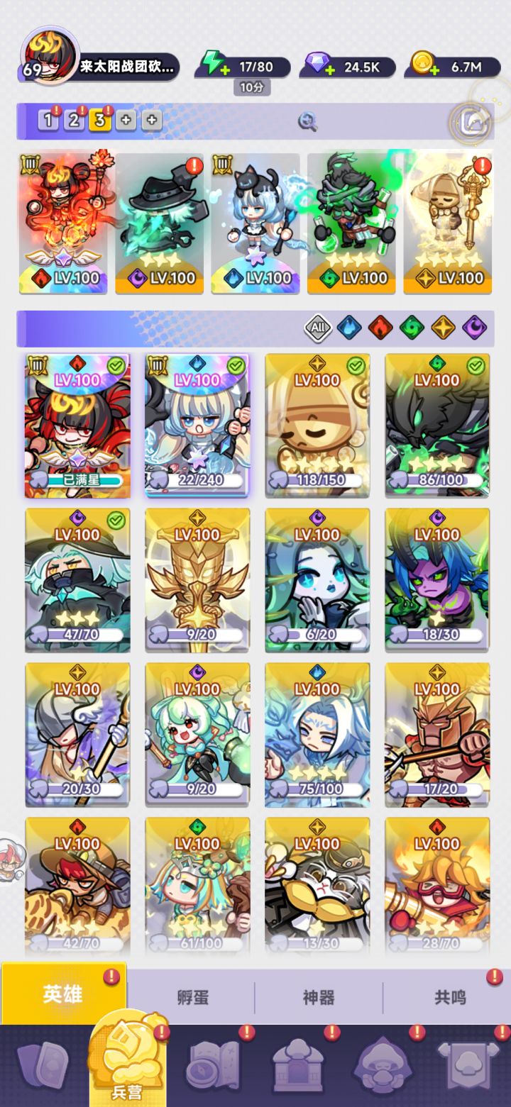本游戏目前无存钻石存抽卡消耗活动,每第四周有大富翁活动走到相应格子可以购买打折露珠(10k钻石够用)多余的钻石直接抽卡就行了。每天用普通池积分换5个光暗池露珠。⭐️存资源拉满一个满星光暗角色⭐️前期三个月一个满星,后期一个月不到就可以满一个。Ⅰ推关玩法推荐心愿角色 普通池:沉默菇 光暗池:存着神器池:退魔拳套 普通神器:烈焰火炬1-121关阵容:10⭐️沉默菇(3级专武),1⭐️