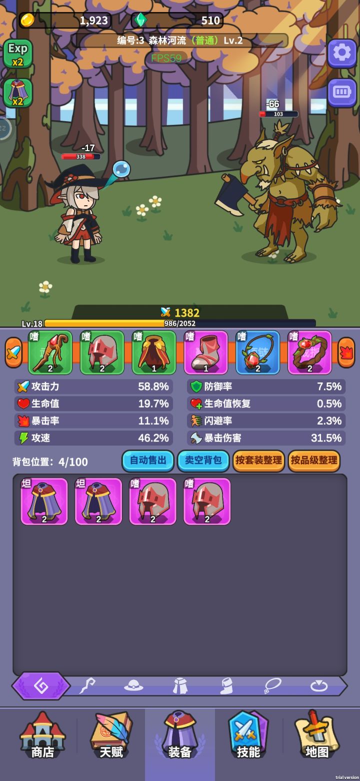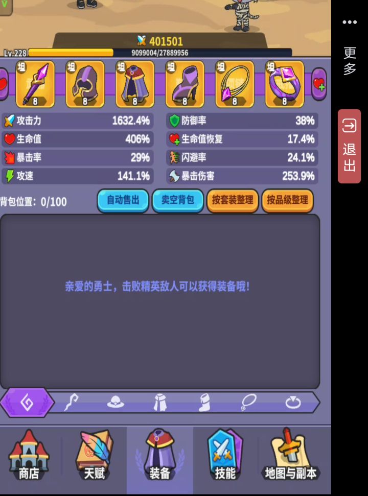 很佛系的放置类游戏,不肝也不氪。在线就是操作一下养成,以及装备搭配等内内容。可以根据自身战斗力选择适合的关卡地图挂机,即使挂掉也会复活继续打,只是收益效率问题。